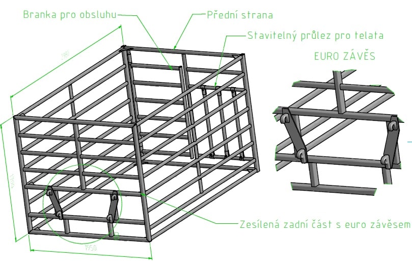 Slouží k bezpečnému odchycení telat. Vhodné pro oddělení telete od ostatních zvířat a následné ošetření. Přístup do klece pomocí dvířek. Na zádní části klece je umístěn průlez pro telata.